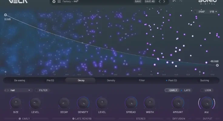 From ultra real spaces to impossibly massive soundscapes Vela is unmatched in versatility and sound. Vela gives you total control over every aspect of a reverb’s architecture with its fully customizable early reflection system combined with a node based late reflection engine enabling you to finely tune density, decay and damping filter over time for a luscious, smooth tail.