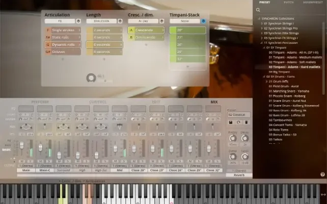 Synchron Timpani III features five Adams Artist Alpha timpani with diameters of 20″, 23″, 26″, 29″, and 32″, played with hard mallets, as well as the “Big Timpani” setup of Big Bang Orchestra Fornax. These instruments are also included in the Synchron Percussion III CollectionTimpani Adams 20″, 23″, 26″, 29″, 32″Big Timpani Adams Philharmonic Light 26″–32″, big taiko 36″, bass drum Kolberg “Dicke Bertha” 36″Recorded in the large Stage A of Vienna Synchron StageMore than 29,700 Samples (Full Library)Captured with 12 microphones (Full Library)The five Adams timpani that are permanently stored and maintained at Synchron Stage Vienna cover a range of two octaves, from C2 to C4. Single hits were recorded in open and muted variants, and there are also static and dynamic rolls at your disposal. As a bonus, the Big Timpani setup features an odaiko (the largest taiko drum), two timpani tuned in octaves, and bass drum “Dicke Bertha”, all performed and recorded together.