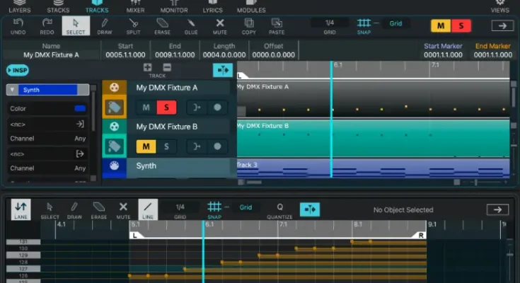DMX control has also been improved. Previously limited to tracks, it is now accessible directly in the mixer, complete with dedicated faders for intensity, mute, and solo. This feature places your DMX programming right where you control your sounds and music.