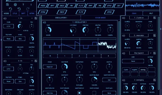 3 wave-slicing oscillators so you can slice up to 16 waveforms per oscillator for unheard, complex new tones
